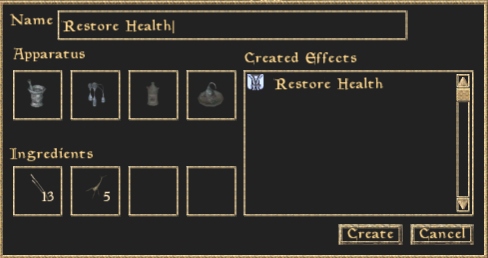 Zum Herstellen eines Tranks in einen freien Slot klicken, aus der Liste eine Zutat wählen, genau so beim zweiten Slot. Wenn die Zutaten eine gemeinsame Wirkung haben, wird das im Fenster rechts angezeigt und man kann den Trank erzeugen (mit einer Wahrscheinlichkeit entsprechend dem alchemy skill). Tränke können durchaus zwei Wirkungen haben, nicht zwingender Weise beide positiv. Negative werden in rot dargestellt, d. h. zwei der Zutaten haben die selbe negative Wirkungen, man sollte einen Austausch mit einer anderen Zutat versuchen.