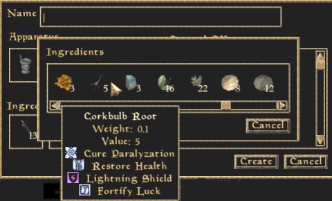 Hier hat z. B. die Corkbulb Root (Korkwurzel) unter anderem die Eigenschaft Restore Health (Lebensenergie Wiederherstellen). Auch die erste Zutat hat diese Eigenschaft, deshalb wird im Fenster rechts diese Wirkung des Tranks angezeigt.