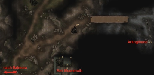 Die Wegbeschreibung, die man von Hasphat Antabolis bekommt, ist eigentlich sehr genau: Balmora Richtung Süden verlassen (am Silt Strider vorbei), dann nach Osten über die Brücke, dem Weg nach Fort Moonmoth folgen. An der Weggabelung vor dem Fort nach Norden gehen, kurz darauf an der Abzweigung nach Osten wenden. Dem Weg folgen und über die Brücke gehen, danach nach Süden wenden. Ein paar Meter vor dem Eingang ist eine kleine Kurbel, die man betätigen muss, um den Eingang nach Arkngthand zu öffnen.