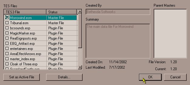 In dem erscheinenden Fenster den Eintrag “Morrowind.esm” doppelklicken um ihn anzuhaken. Ok drücken.