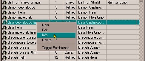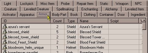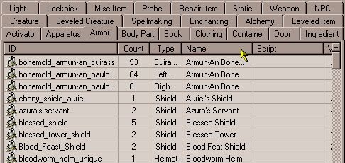 Im Objekt-Fenster kann man nun verschiedene Listen über die Karteireiter auswählen, z. B. NPC (für Personen) oder Alchemy (für Tränke und Zutaten) oder Books (für Bücher, Schriftrollen und andere Notizen) oder Armor (für Rüstungen) usw.