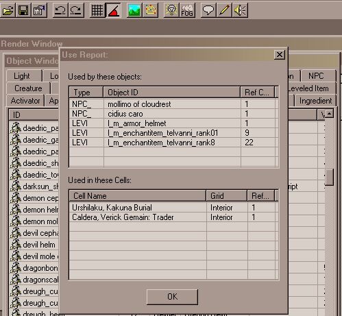 Im oberen Teil sind Objekte verzeichnet, die den Gegenstand enthalten können (NPCs oder Schatztruhen, in denen der Gegenstand als Level-abhängiges Zufallsereignis erscheint), im unteren Teil ist eine Liste der Zellen, die den Gegenstand enthalten, also z. B. bestimmte Läden oder ein Dungeon usw.). Nun kann man sich notieren, wo man das Gesuchte am einfachsten oder in größter Menge finden kann. |